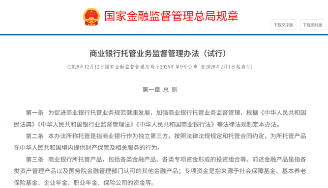 12月12日,国家金融监督管理总局发布《商业银行托管业务监督管理办法(试行)》(以下简称《办法》)。