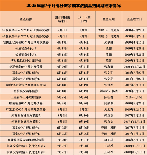 据记者统计,预计4月份将有7只产品结束封闭期,分别为华泰紫金丰安27个月定开A份额和C份额、富国汇优纯债63个月定开、长盛稳益6个月A份额和C份额、博时稳悦63个月定开、华夏恒泰64个月定开。