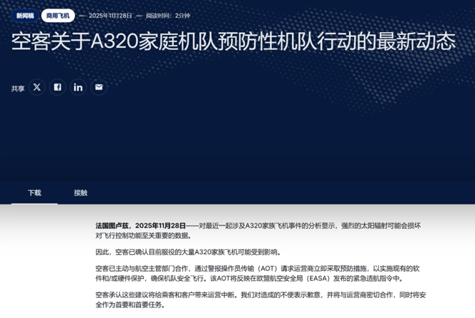 12月1日,空客中国表示,截至2025年11月30日,中国民航机队中的A320系列飞机均已按照适航指令和空客技术文件完成相关工作。所有运营中的A320系列飞机执行的航班运行平稳正常。