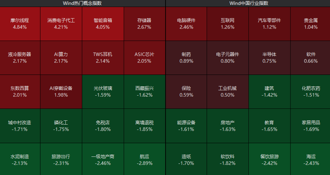 板块上来看,消费电子板块高开高走,摩尔线程相关概念股大涨,汽车零部件、贵金属、AI算力等板块表现活跃;而航运、餐饮旅游、房地产等板块跌幅居前。