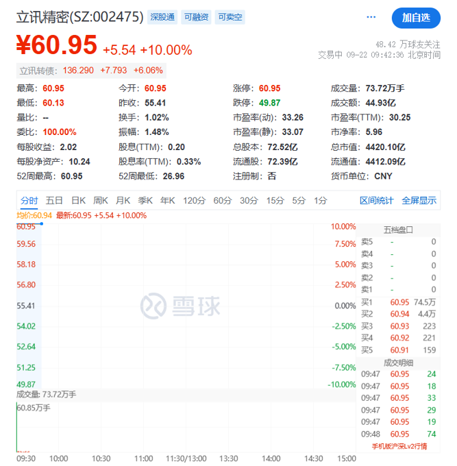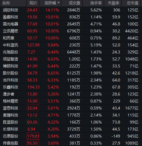 消费电子板块高开高走,立讯精密、国光电器、盈趣科技、和而泰等涨停,领益智造、歌尔股份、传音控股等跟涨。