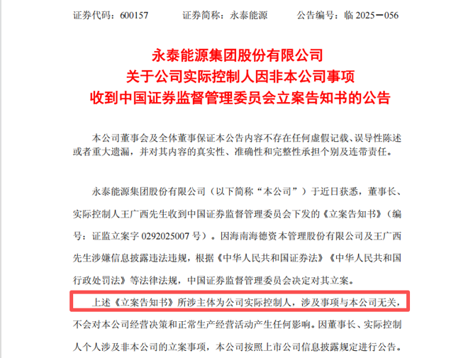 永泰能源、海伦哲均在公告中提到,此次中国证监会的立案主体是海德股份、王广西,涉及事项与永泰能源、海伦哲无关。