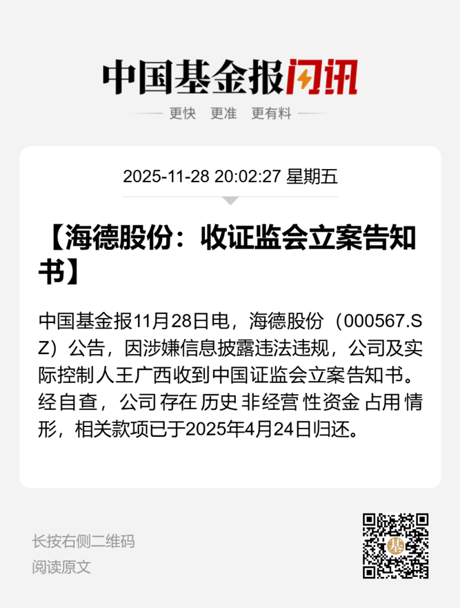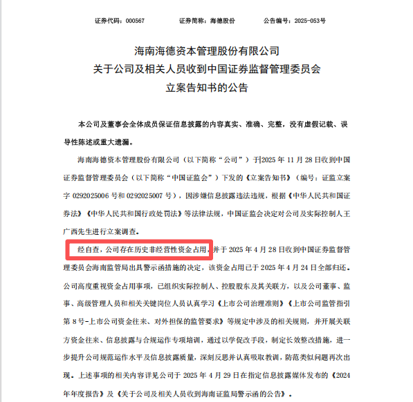 2025年4月28日,海德股份收到海南证监局出具的《关于对海南海德资本管理股份有限公司、王广西采取出具警示函措施的决定》。