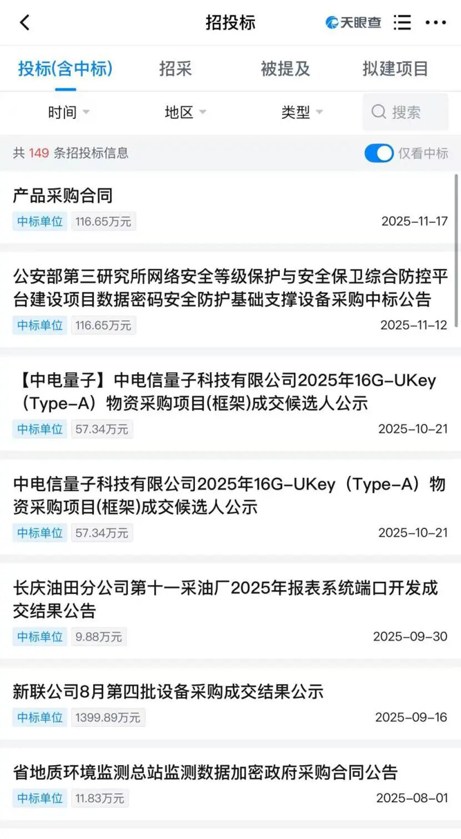 值得注意的是,数盾科技是首批获得国家密码管理局认定具有商用密码资质的公司、工信部专精特新“小巨人”企业、中国网络安全产业百强企业以及中国网络产业密码领域10强企业。天眼查显示,数盾科技今年以来已有多达108项中标记录,覆盖能源、金融、交通等多个行业。