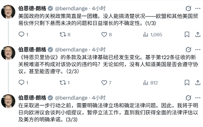 朗格周日在社交媒体上写道:“美国政府方面纯粹是关税混乱。没人能再理解它了——留给欧盟和其他美国贸易伙伴的只有无法回答的问题和不断增长的不确定性。”