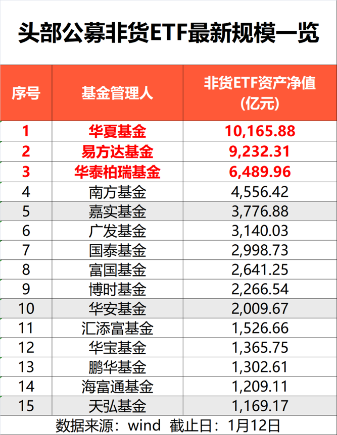 Wind数据显示,截至1月12日净值更新,华夏基金旗下非货ETF管理规模达10165.88亿元,首次突破1万亿元整数关口。