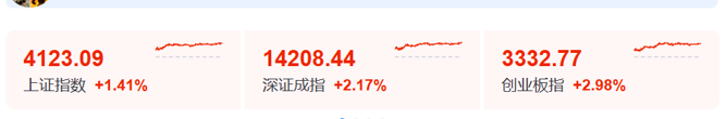2月9日,A股、港股全线大涨。市场全天高开高走,沪指涨超1%,重返4100点上方,截至收盘,沪指涨1.41%,深成指涨2.17%,创业板指涨2.98%。