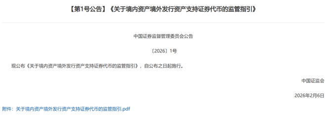6日晚间,同一时刻,中国证监会公布《关于境内资产境外发行资产支持证券代币的监管指引》,自公布之日起施行。