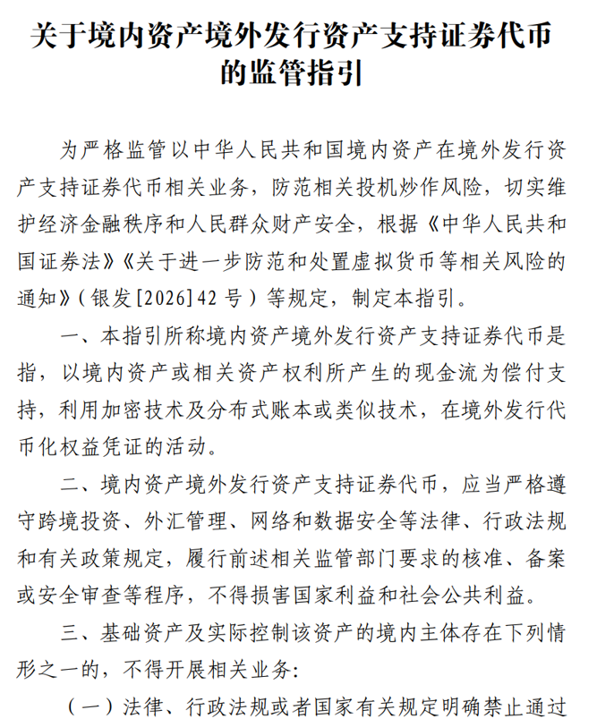 央行等八部门印发通知进一步防范和处置虚拟货币交易炒作风险2月6日晚间,中国人民银行等八部门发布关于进一步防范和处置虚拟货币等相关风险的通知。1.近期,虚拟货币、现实世界资产(RWA)代币化相关投机炒作活动时有发生,扰乱经济金融秩序,危害人民群众财产安全。比特币、以太币、泰达币等虚拟货币不具有法偿性,不应且不能作为货币在市场上流通使用。4.在境内开展法定货币与虚拟货币兑换业务、虚拟货币之间的兑换业务、作为中央对手方买卖虚拟货币、为虚拟货币交易提供信息中介和定价服务、代币发行融资以及虚拟货币相关金融产品交易等虚拟货币相关业务,一律严格禁止,坚决依法取缔。5.境外单位和个人不得以任何形式非法向境内主体提供虚拟货币相关服务。6.挂钩法定货币的稳定币在流通使用中变相履行了法定货币的部分功能。未经相关部门依法依规同意,境内外任何单位和个人不得在境外发行挂钩人民币的稳定币。7.在境内开展现实世界资产代币化活动,以及提供有关中介、信息技术服务等,应予以禁止;经业务主管部门依法依规同意,依托特定金融基础设施开展的相关业务活动除外。8.境外单位和个人不得以任何形式非法向境内主体提供现实世界资产代币化相关服务。9.做好线上监控、线下摸排、资金监测的有效衔接,高效、精准识别虚拟货币、现实世界资产代币化相关活动。10.有关中介机构、信息技术服务机构不得为未经同意的现实世界资产代币化相关业务以及相关金融产品提供中介、技术等服务。11.企业、个体工商户注册名称和经营范围中不得含有“虚拟货币”“虚拟资产”“加密货币”“加密资产”“稳定币”“现实世界资产代币化”“RWA”等字样或内容。13.未经相关部门依法依规同意,境内主体及其控制的境外主体不得在境外发行虚拟货币。14.境内主体直接或间接赴境外开展外债形式的现实世界资产代币化业务,或者以境内资产所有权、收益权等为基础在境外开展类资产证券化、具有股权性质的现实世界资产代币化业务,应按照“相同业务、相同风险、相同规则”原则,由国家发展改革委、中国证监会、国家外汇局等相关部门按照职责分工,依法依规进行严格监管。对于境内主体以境内权益为基础在境外开展的其他形式的现实世界资产代币化业务,由中国证监会会同相关部门按职责分工监管。未经相关部门同意、备案等,任何单位和个人不得开展上述业务。15.境内金融机构的境外子公司及分支机构在境外提供现实世界资产代币化相关服务要依法稳慎,配备专业人员及系统,有效防范业务风险,严格落实客户准入、适当性管理、反洗钱等要求,并纳入境内金融机构的合规风控管理体系。中国证监会公布2026年第1号公告