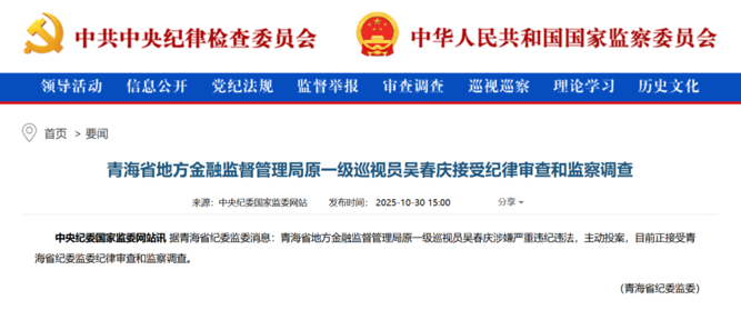 10月30日,中央纪委国家监委官网通报:青海省地方金融监督管理局原一级巡视员吴春庆涉嫌严重违纪违法,主动投案,目前正接受青海省纪委监委纪律审查和监察调查。