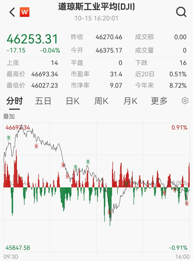 美国三大股指收盘涨跌不一,道指跌0.04%报46253.31点;标普500指数涨0.4%报6671.06点;纳指涨0.66%报22670.08点。