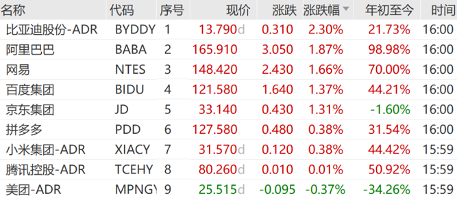 比亚迪股份涨2.30%,阿里巴巴涨1.87%,网易涨1.66%,领涨中概科技龙头指数成份股。