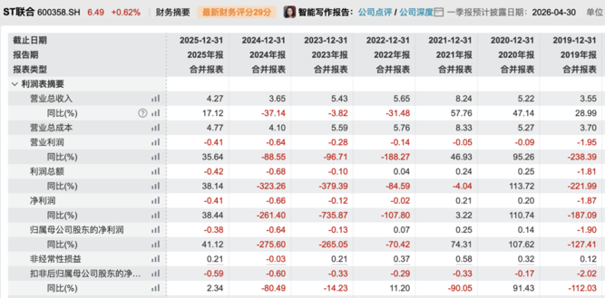 业绩方面,ST联合2025年实现营业收入4.27亿元,同比增长17.12%;归母净利润为-3750.78万元,上年同期亏损6370.31万元。拉长时间来看,ST联合业绩表现并不稳定,2023年、2024年净利润均大幅亏损。