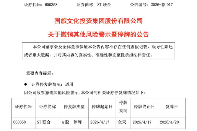 4月16日,ST联合发布公告称,公司股票将于4月17日停牌一天,自4月20日起复牌交易并撤销其他风险警示,公司A股证券简称将由“ST联合”变更为“国旅联合”,证券代码仍为“600358”。