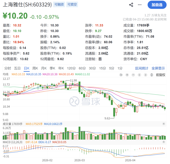 截至4月23日收盘,上海雅仕报10.2元/股,跌幅为0.97%,总市值为25.51亿元。