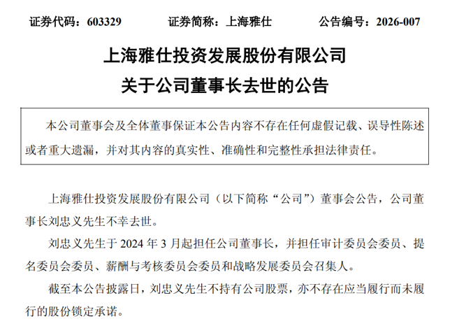 4月23日,上海雅仕董事会发布公告称,董事长刘忠义不幸去世。