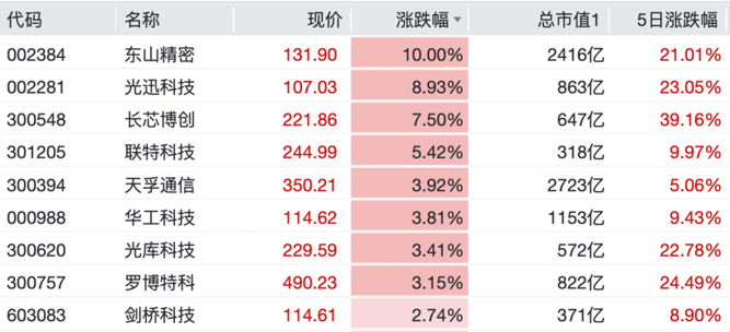 长芯博创涨7.5%,股价继续创历史新高。光迅科技涨近9%,联特科技涨超5%,天孚通信、长飞光纤、华工科技、光库科技、罗博特科等均涨超3%。