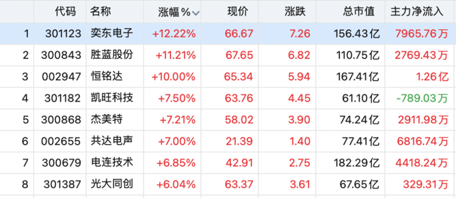 消费电子板块活跃,立讯精密涨近5%,奕东电子涨超12%,胜蓝股份涨超11%,恒铭达录得10cm涨停,凯旺科技、杰美特、共达电声等涨幅超7%。