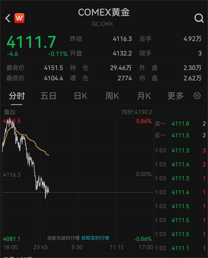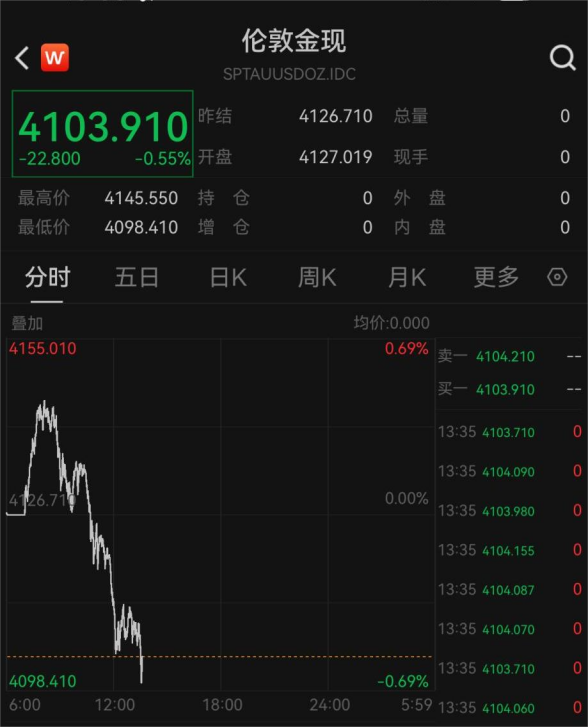 截至发稿,伦敦金现报4103.91美元/盎司,跌幅达0.55%;COMEX黄金报4111.7美元/盎司,跌幅达0.11%。
