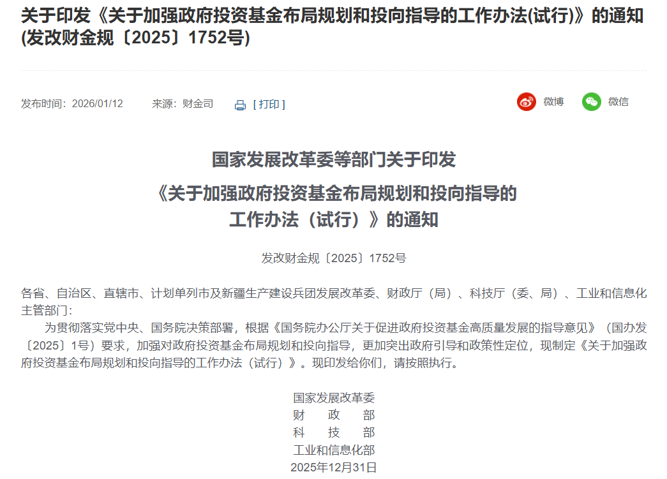 1月12日,国家发展改革委、财政部、科技部、工业和信息化部联合发布《关于加强政府投资基金布局规划和投向指导的工作办法(试行)》(以下简称《工作办法》),旨在加强政府投资基金布局规划和投向指导。