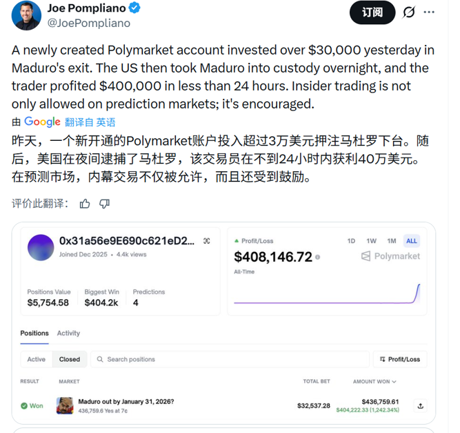 数据显示,这个账户不到一周前才创建;在袭击发生前一天,它投入了超过3万美元,随后获利超过40万美元。这一异常交易很快在社交媒体上被人点名,许多人猜测下注者掌握了内幕信息,甚至可能在五角大楼工作。投资人兼播客主Joe Pompliano也迅速在X上指出:“在预测市场,内幕交易不仅被允许,甚至某种程度上是被鼓励的。”