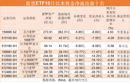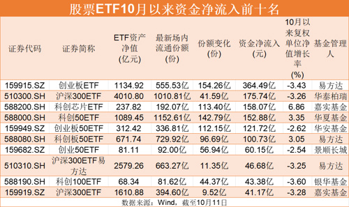 10月第一周,A股市场从之前的逼空式上涨转为宽幅震荡,股票ETF也从周初的大幅净流入,到了周中及周末转为小幅净流出。从全周来看,股票ETF资金净流入金额依旧可观。据银河证券基金研究中心数据统计,截至10月11日,股票ETF(含跨境ETF)过去一周资金净流入接近1500亿元,仅10月8日当天资金净流入就超过千亿元。从指数看,创业板指、沪深300指数、科创50指数等主要宽基指数较受市场青睐,多只跟踪上述指数的龙头ETF过去一周资金净流入均在百亿元之上,证券、芯片、半导体、红利类ETF则遭到资金减持。从上周五(10月11日)的情况看,宽基ETF为唯一保持净流入的类型,达到7.18亿元,而行业ETF大幅净流出62.93亿元。具体到指数维度,宽基方面,10月11日,跟踪沪深300指数的ETF单日净流入居前,达到57.27亿元,跟踪中证1000指数的ETF单日净流出居前,达到48.85亿元。从最近5个交易日的角度观测,近期资金流入沪深300指数及创业板指数ETF分别超460亿元和430亿元,科创50指数相关ETF近5日净流入亦超380亿元。行业方面,暂无相关行业ETF进入单日净流入前五,而中证全指半导体和证券指数相关ETF净流出较多,分别达到12.70亿元和16.27亿元。从过去一周情况看,上证指数冲高回落,10月8日早盘一度冲高至3674.40点,然后开始震荡回调,10月11日尾盘报收3217.74点,单周下跌3.56%,周振幅更是高达14.58%。银河证券基金研究中心数据显示,10月8日资金大幅净流入1017.98亿元,10月9日继续净流入516.93亿元。到了下半周开始净流出,10月10日及10月11日分别净流出1.75亿元、62.65亿元。头部基金公司旗下部分ETF持续获得资金净流入。10月11日,沪深300ETF易方达当日资金净流入8.68亿元,总规模达到2579.26亿元。创业板200ETF易方达、上证50ETF易方达、科创创业ETF、人工智能ETF也获得不同程度的资金净流入。华夏基金旗下ETF中,10月11日,科创50ETF获得38.27亿元净流入,总规模达到1089.45亿元,对应跟踪指数科创50指数近一月日均成交额为77.34亿元。作为跟踪股票市场“最锋利的矛”,在行情大幅波动中,多只股票ETF备受市场关注。据Wind数据统计,截至10月11日,有6只股票ETF单周资金净流入超过百亿元。其中,易方达创业板ETF单周资金净流入高达364.49亿元,该ETF总规模在10月8日冲高至1326亿元,进入千亿级股票ETF“俱乐部”之列,随后几个交易日规模也保持在千亿元之上。华泰柏瑞沪深300ETF、嘉实科创芯片ETF、华夏科创50ETF、华安创业板50ETF、易方达科创板50ETF紧随其后,资金净流入金额分别达到175.74亿元、158.07亿元、152.88亿元、121.72亿、100.73亿元。华安基金表示,9月末受政策“大礼包”催化,市场情绪出现较大修复。政策方面,证监会表示通过支持企业并购重组进一步促进资源有效配置,重点提出支持上市公司向新质生产力方向转型升级,积极支持上市公司围绕战略性新兴产业、未来产业等进行并购重组,支持科创板、创业板公司并购产业链上下游资产,科技龙头公司受益,以创业板为代表的高新科技板块的投资机会或开始显现。而从资金净流出方面看,此前反弹力度较大的证券、半导体、芯片类的ETF遭遇获利了结,红利方面的ETF资金也出现不同程度的资金净流出。政策利好频出,外资如何看中国?
