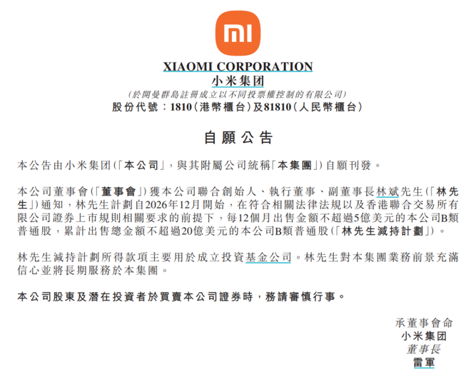 根据小米2025年中期报告披露,林斌通过其控股实体合计持有小米约18.35亿股B类股份,占公司已发行股本约8.56%。按照最新市值来看,林斌持有的股份价值超过100亿美元。