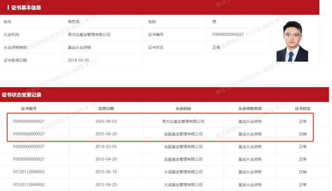 中国证券投资基金业协会备案信息显示,杨思亮的从业机构已于9月3日变更为易方达基金,其在宝盈基金的从业记录则于8月29日注销。至此,这位宝盈基金昔日的权益核心人物去向正式落定。