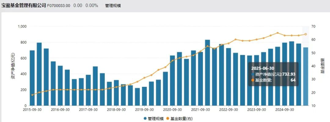 从整体规模来看,Wind数据显示,截至2025年6月底,宝盈基金公募基金资产管理规模为732.93亿元,较2015年年中的826.81亿元缩水近百亿元。