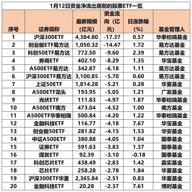 从单日资金净流出排行看,沪深300ETF、创业板ETF、科创50ETF、A500ETF等宽基ETF成为“失血”大户,券商ETF、光伏ETF等资金净流出也居前。