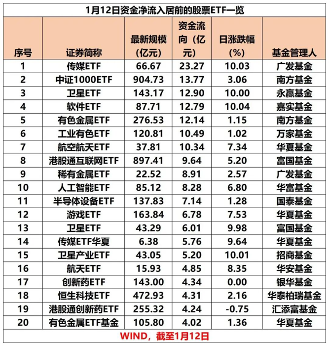 1月12日,A股三大指数继续强势表现,沪指日线17连阳再创逾十年新高。股票ETF资金净流入超130亿元。其中,传媒、卫星、软件、有色金属等热门主题ETF资金净流入居前,沪深300ETF、创业板ETF、科创50ETF、A500ETF等宽基ETF成为“失血”大户。