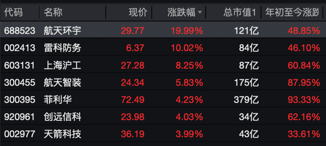 个股方面,航天环宇20cm涨停,雷科防务10cm涨停,成电光信、中国海防、佳驰科技、智明达等跟涨。