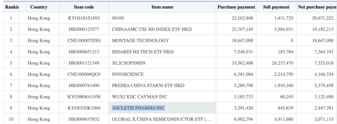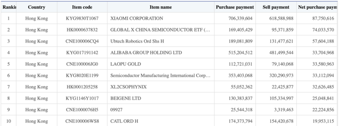其中,韩国股民买入Minimax-WP金额为2067.12万美元,买入华夏沪深300ETF的金额为1918.22万美元,买入澜起科技1864.71万美元,买入安硕恒生科技ETF是金额为736.47万美元,买入南方东英每日杠杆三星电子是金额为732.50万美元,买入英诺赛科的金额为416.63万美元,买入Premia中国科创50ETF的金额为337.95万美元,买入药明合联312.55万美元,买入歌礼制药244.78万美元,买入GlobalX中国半导体ETF207.11万美元。