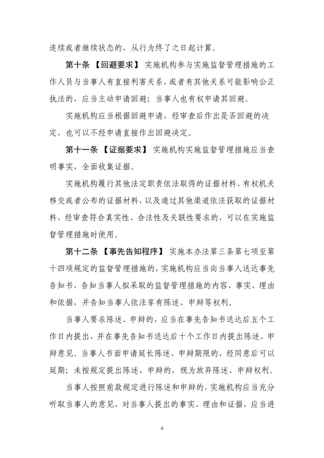 四是参与实施监管措施的工作人员与当事人有直接利害关系,或者有其他关系可能影响公正执法的,应当回避;五是实施监管措施应当查明事实,全面收集有关证据;六是实施监管措施应当进行法制审核。