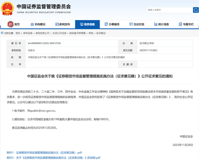 11月28日,证监会官网显示,证监会就《证券期货市场监督管理措施实施办法(征求意见稿)》(以下简称《实施办法》)公开征求意见,意见反馈截止时间为2025年12月28日。