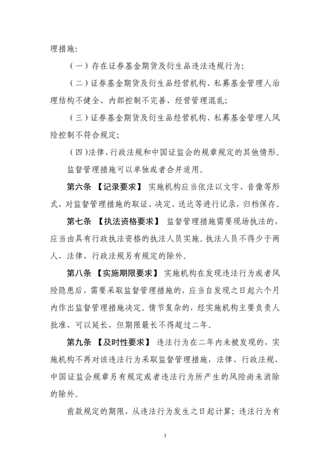 一是实施机构应当对监管措施的取证、决定、送达等依法“留痕”;二是监管措施需要现场执法的,应当由具有行政执法资格的执法人员实施,执法人员不得少于两人;三是违法行为在二年内未被发现的,实施机构一般不再对该违法行为采取监管措施,但另有规定或者风险尚未消除的除外;