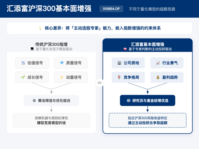 如果说安中动态代表的是行业配置增强,量化指增代表的是多因子选股增强,那么汇添富沪深300基本面增强,走的则是第三条路:依托主动权益投研体系,在宽基框架内做基本面精选,把主动选股能力转化为指数增强能力。