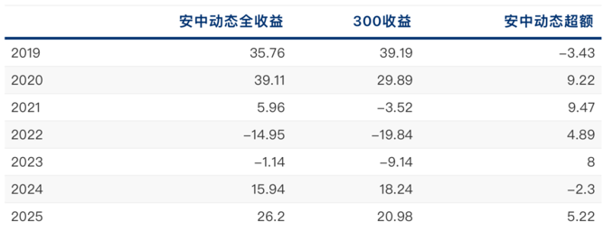 从2019年至2025年的起年表现来看,安中动态呈现了颇为不俗的超额表现,跑赢的年份往往有显著超额,跑输的年份不多,而且往往只是小幅跑输。