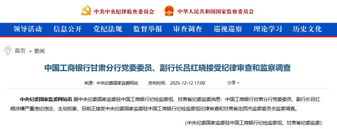【导读】中国工商银行甘肃分行党委委员、副行长吕红晓接受纪律审查和监察调查