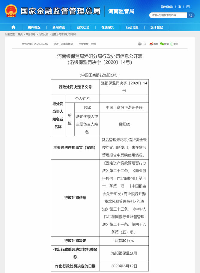 值得注意的是,吕红晓在洛阳分行任职期间,中国工商银行洛阳分行曾因涉及贷后管理未尽职,信贷资金未按约定用途使用,未在贷后管理报告中反映使用情况等违法违规行为,被处罚款30万元。