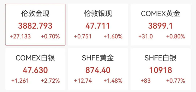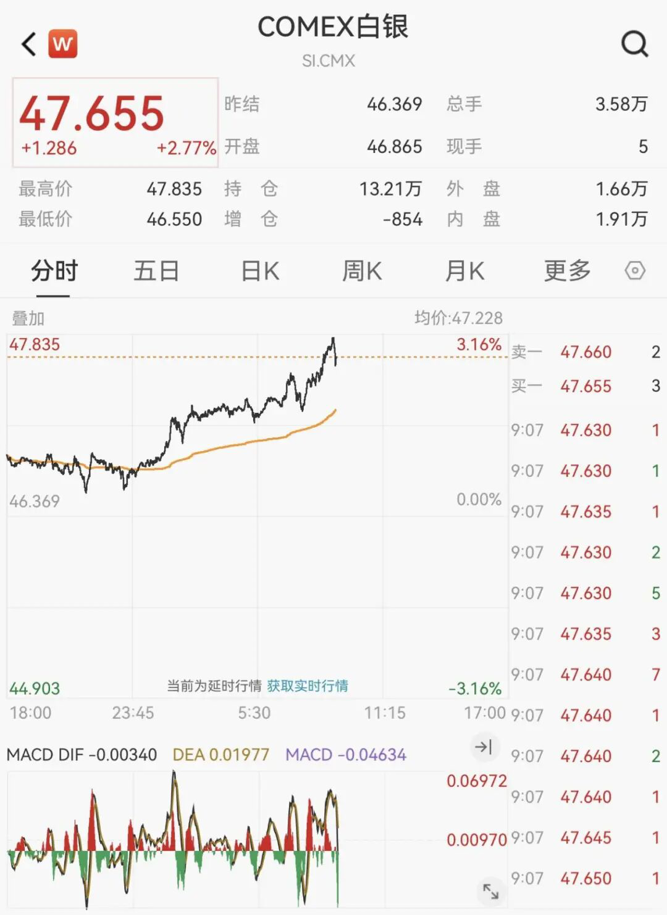 美联储降息预期升温且美元走弱,为贵金属再度走强提供支持,现货白银一度涨超3%,现报47.66美元/盎司。
