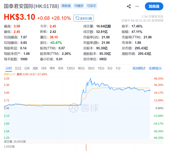 此外,今天还有一件事情值得关注,就是港股的国泰君安国际盘中直线暴力拉升,涨约30%。