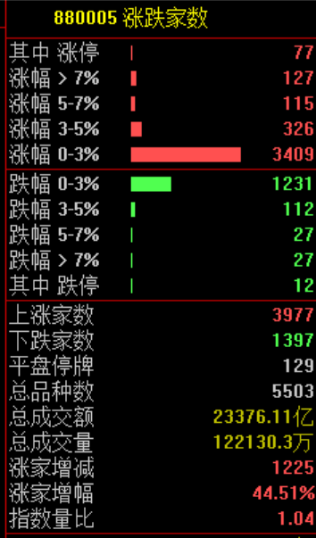 两市共3977只个股上涨,77只个股涨停,1397只个股下跌。
