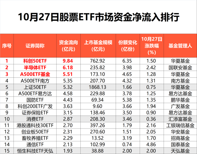 其中,华夏基金旗下科创50ETF净流入近10亿元,位居全市场首位。半导体ETF、A500ETF基金也有超5亿元的净流入。