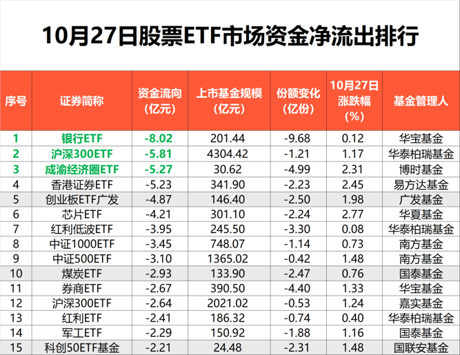 具体来看,银行ETF昨日净流出超8亿元,位居全市场首位。另外,成渝经济圈ETF、香港证券ETF等净流出也超5亿元。