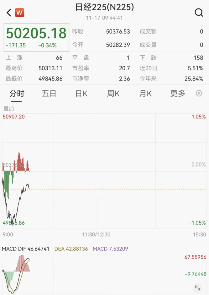 11月17日,日本股市开盘大跌,日经225指数一度跌超1%。