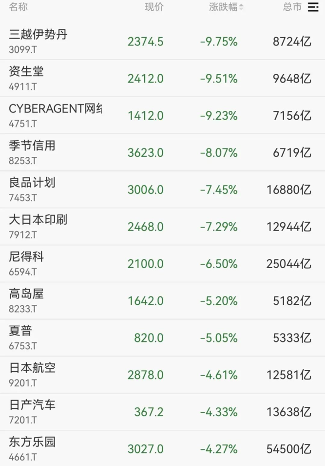 日本旅游相关概念股大幅下挫,资生堂股价下跌11%,日本航空一度下跌5%。日本消费品、零售股同样走低,三丽鸥、亚瑟士、迅销等均跌超6%。日本杂货品牌良品计划股价一度下跌12%,创2024年8月以来最大跌幅。
