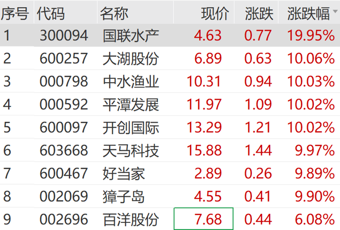 水产板块盘初集体飙涨,国联水产20cm涨停,大湖股份、中水渔业、开创国际等纷纷涨停。