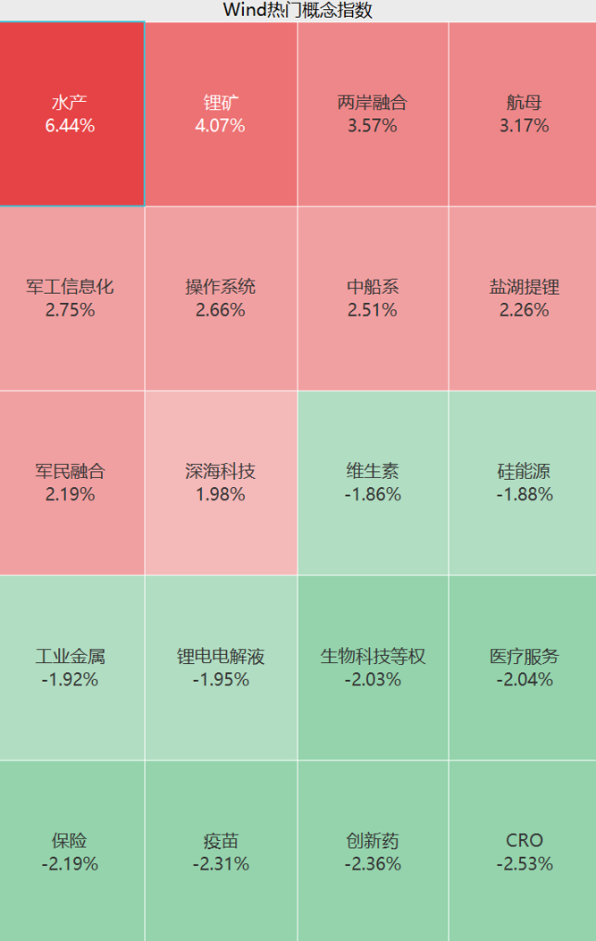 虽然指数整体表现欠佳,但细分板块有机会。上午,国防军工、计算机、林木等板块走高,水产、锂矿、两岸融合、航母等概念股强势;医药、贵金属、保险等板块不振。