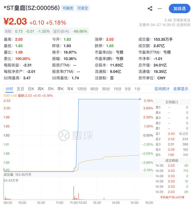 4月27日,*ST皇庭午后涨停,走出“地天板”,成交额为2.87亿元。截至目前,*ST皇庭股价报2.03元/股。